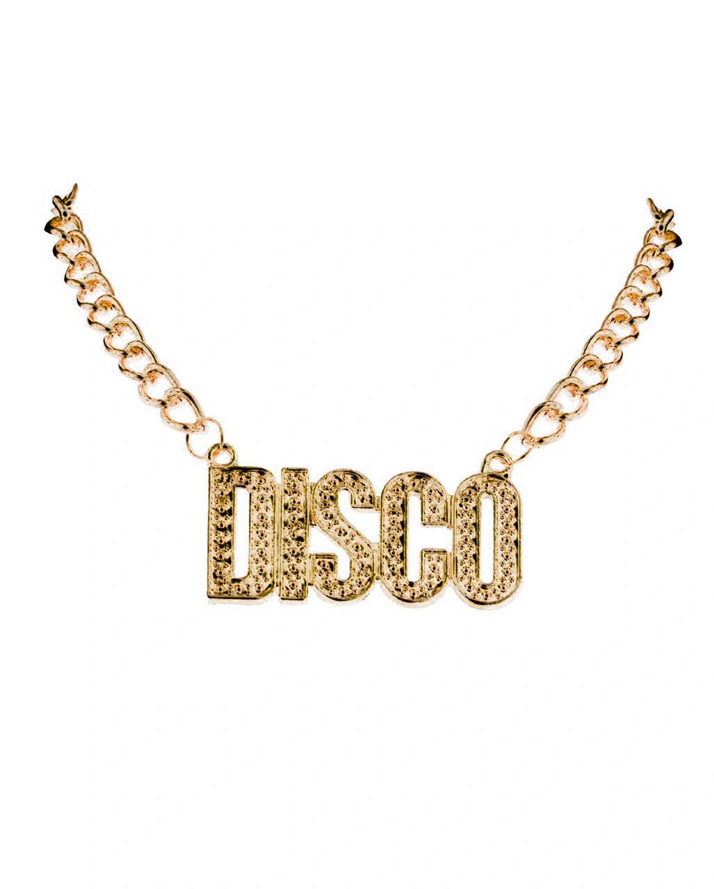 Goldglitzernde Halskette mit „Disco“ Schriftzug als Kostümzubehör