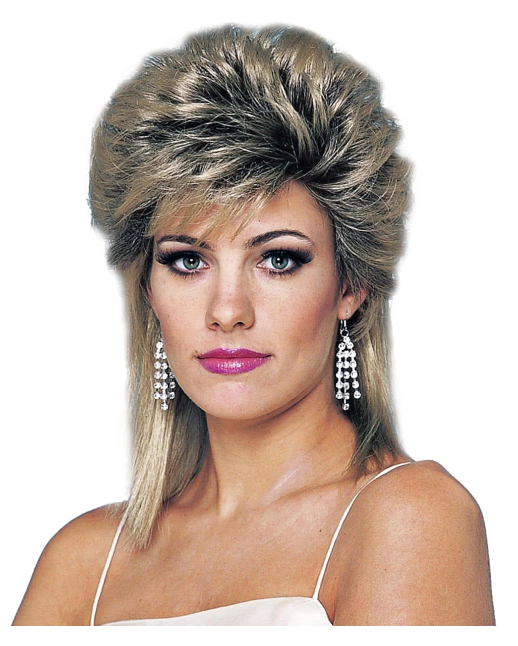Die blond-melierte 80er Jahre Damenperücke ist aus hochwertigem Kunsthaar von bester Qualität gearbeitet, und besitzt mit „vorne kurz“ und „hinten lang“ den klassischen Vokuhila-Look der Achtziger. Besonders die hochtoupierten Haare machen die stylische Perücke zum echten Mottoparty-Hingucker. Für deinen Disco-Auftritt empfehlen wir dir außerdem das 80er Jahre Aerobic Kostüm und die 80er Jahre Ohrringe Neonpink.
