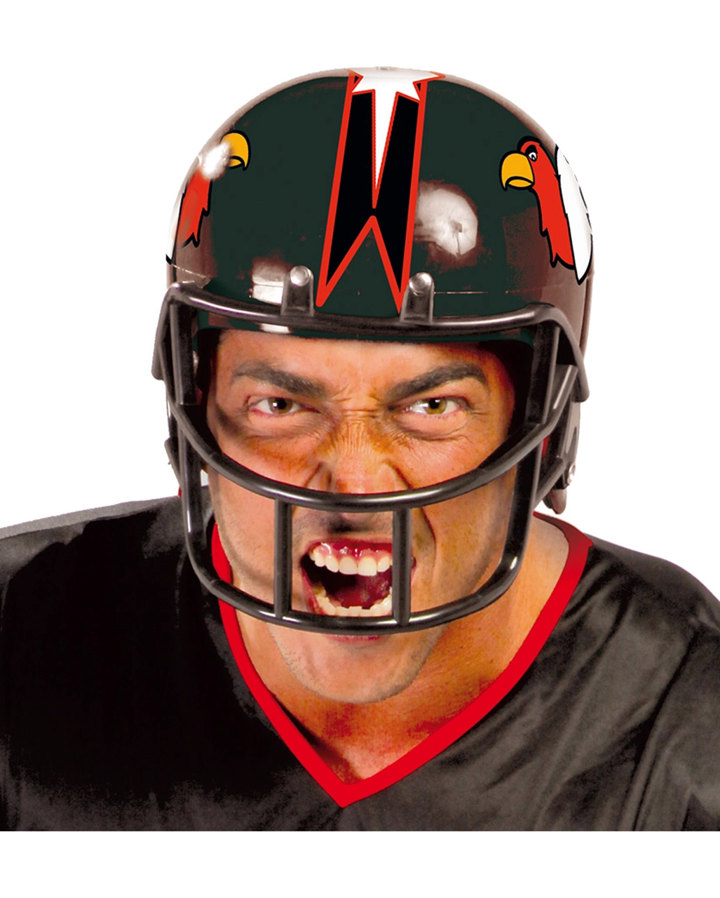 Der schwarze American Football Helm entspricht optisch bis ins Detail den realen Vorbildern aus der amerikanischen Profiliga NFL. Der schwarze Superbowl-Helm wird von grimmig dreinblickenden Wappenvögeln sowie einem roten Streifen mit weißem Stern geschmückt. Ein großzügig bemessenes Gitter schützt dein Gesicht und sorgt gleichzeitig dafür, dass du auf den Faschings-Feiern ausreichend Platz zum Essen und Trinken hast, ohne dein Footballer-Kostümzubehör abnehmen zu müssen. Schaumstoffpolster innen am Sportler-Helm erzeugen ein angenehmes Tragegefühl und verhindern Druckstellen. Dazu passen ein Aufblasbarer Football und der Football Getränkespender.