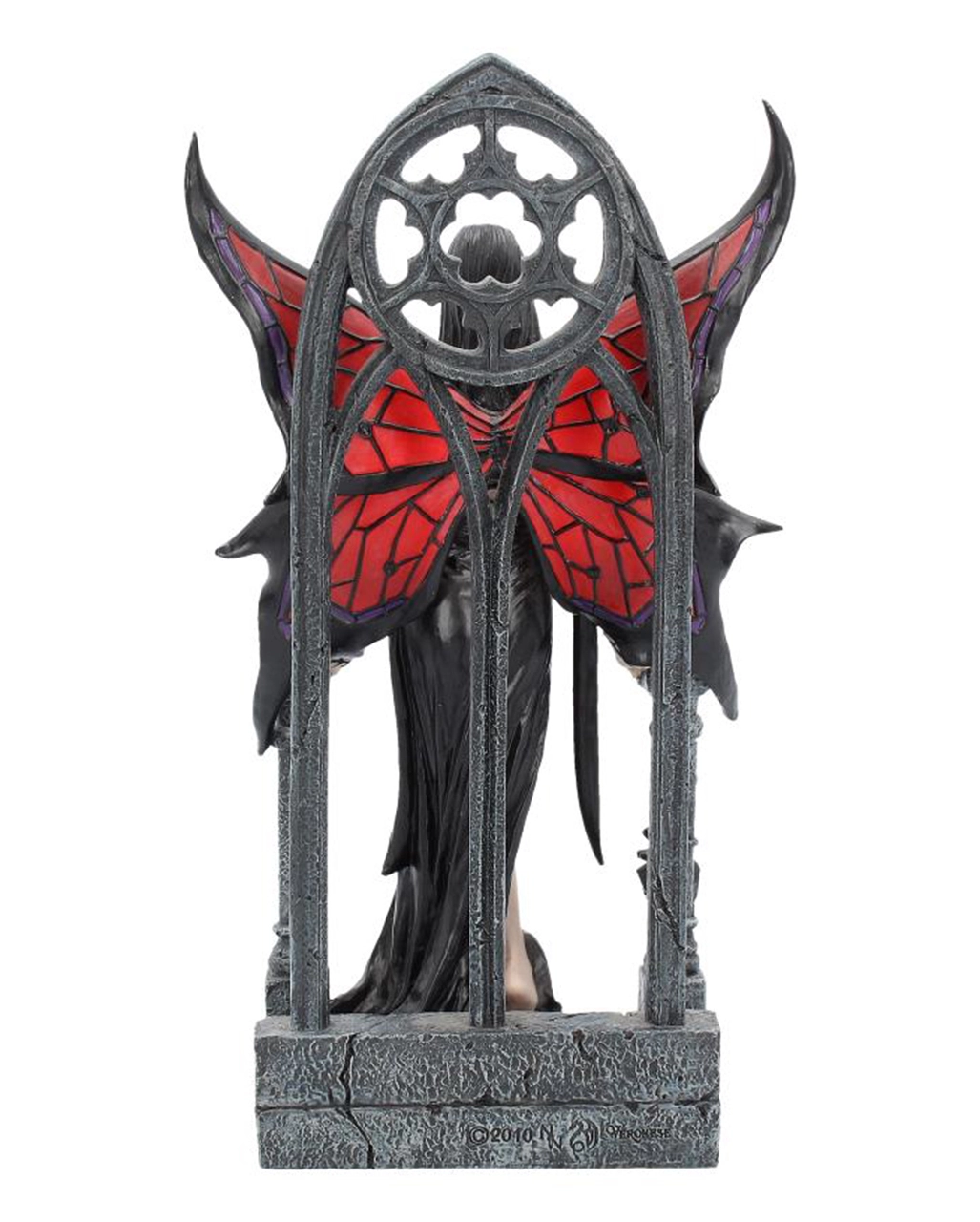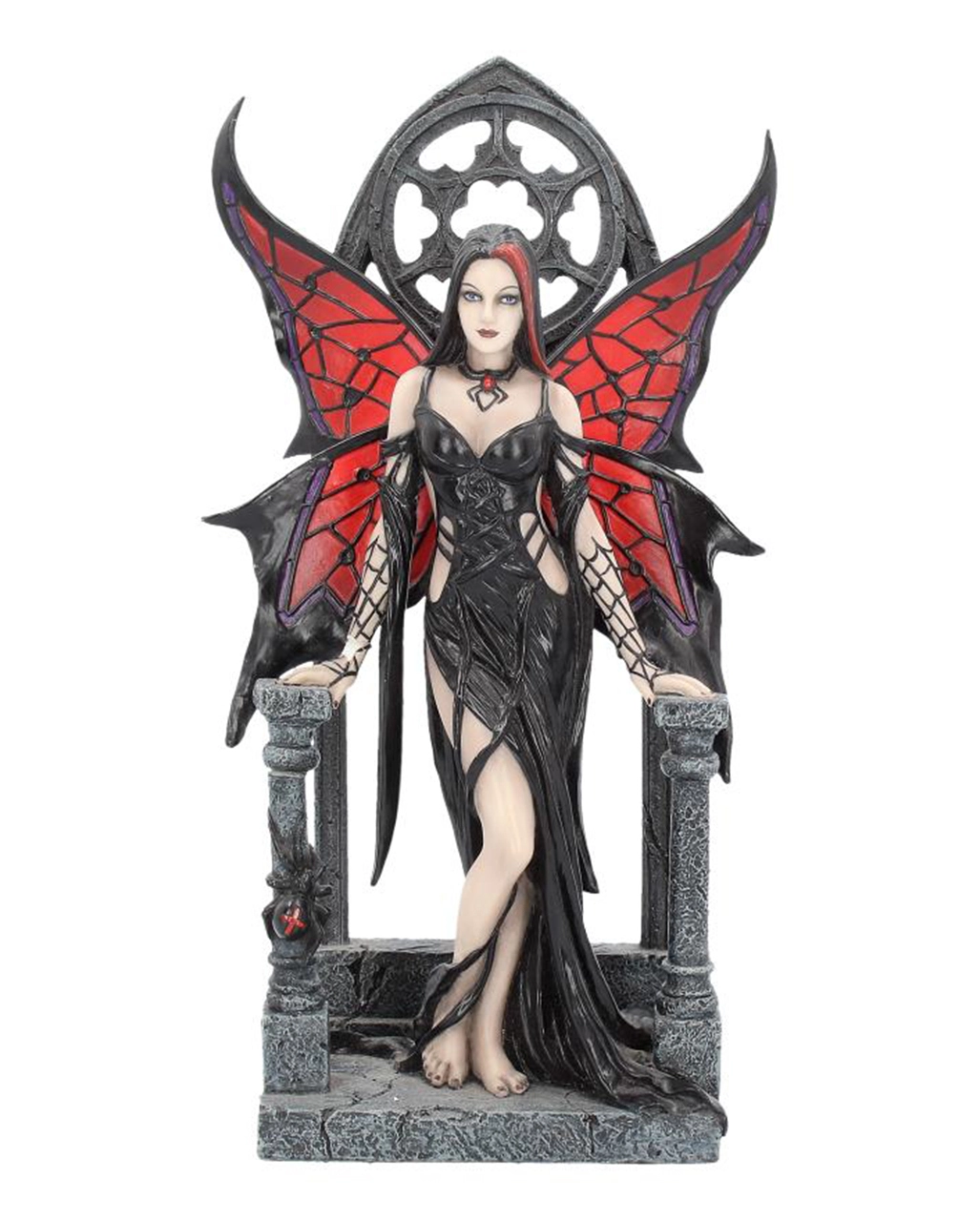 Die bezaubernde Aracnafaria Gothic Fee Figur aus der Gothic Geschenkartikel-Kollektion entstammt der gotischen Fantasie der talentierten Künstlerin Anne Stokes. In einem langen schwarzen Kleid steht diese dunkle Fee barfuß auf dem Boden einer Kirche zwischen zwei grauen Steinpfosten. Hinter ihre anmutigen und düsteren Erscheinung erhebt sich der gotische Bogen eines Kirchenfensters. Sie schaut dich intensiv an, hypnotisch fast. Ihre schwarz-roten Flügel sind hinter ihr ausgebreitet und mit einem Spinnennetzmuster versehen, passend zu dem schwarz-roten Spinnenanhänger, den sie trägt.