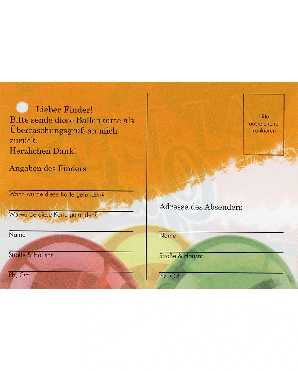 Die 100 Ballon-Flugkarten „Alles Gute“ haben ein geringes Gewicht und können daher einfach von Helium-Luftballons getragen werden. Am oberen rechten Rand befindet sich ein bereits vorgestanztes Loch zum befestigen der Ballonschnur. Die vorgedruckten Ballonkarten mit dem Spruch „Lieber Finder! Bitte sende diese Ballonkarte als Überraschungsgruß an mich zurück. Herzlichen Dank!“ erleichtern dir die Organisation der Party, da du nur noch die Adresse des Geburtstagskinds eintragen musst. Die Ballon-Grußkarten eignen sich perfekt für die Bunte Luftballons 100 St. und die 100 Bunte Luftballons.