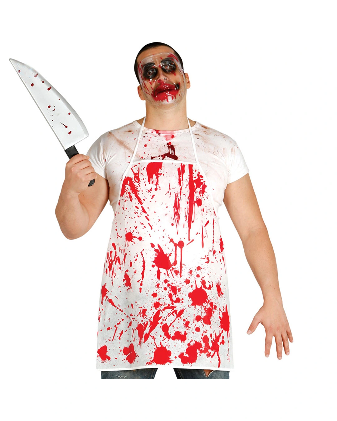 Unsere blutige Schürze als Kostümzubehör in Einheitsgröße passt Frauen wie auch Männern und eignet sich daher super als Gruppenverkleidung. Die weiße Metzgerschürze ist komplett mit roten Blutflecken bespritzt. Wir haben passend dazu das Metzger Messer Butcher Knife & das Kunstblut & Filmblut für Halloween.