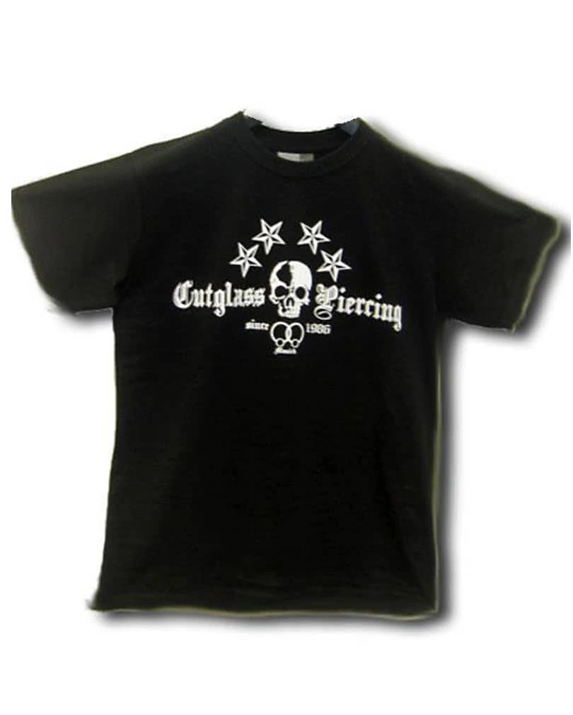Das kultigste Piercing Studio Münchens bringt sein eigenes T Shirt auf den Fashion Markt. Cutglass Piercing ist der Name und steht bereits seit 1986 für Piercing Professionalität im Süddeutschen Raum. Das Cutglass T-Shirt ziert ein Unterkieferloser Skull und Nautic Sterne. Ebenso zu sehen ist das Gründungsjahr. Das angesagte Totenkopf T Shirt ist in schwarz gehalten und der aufwendige Druck in weiß.
