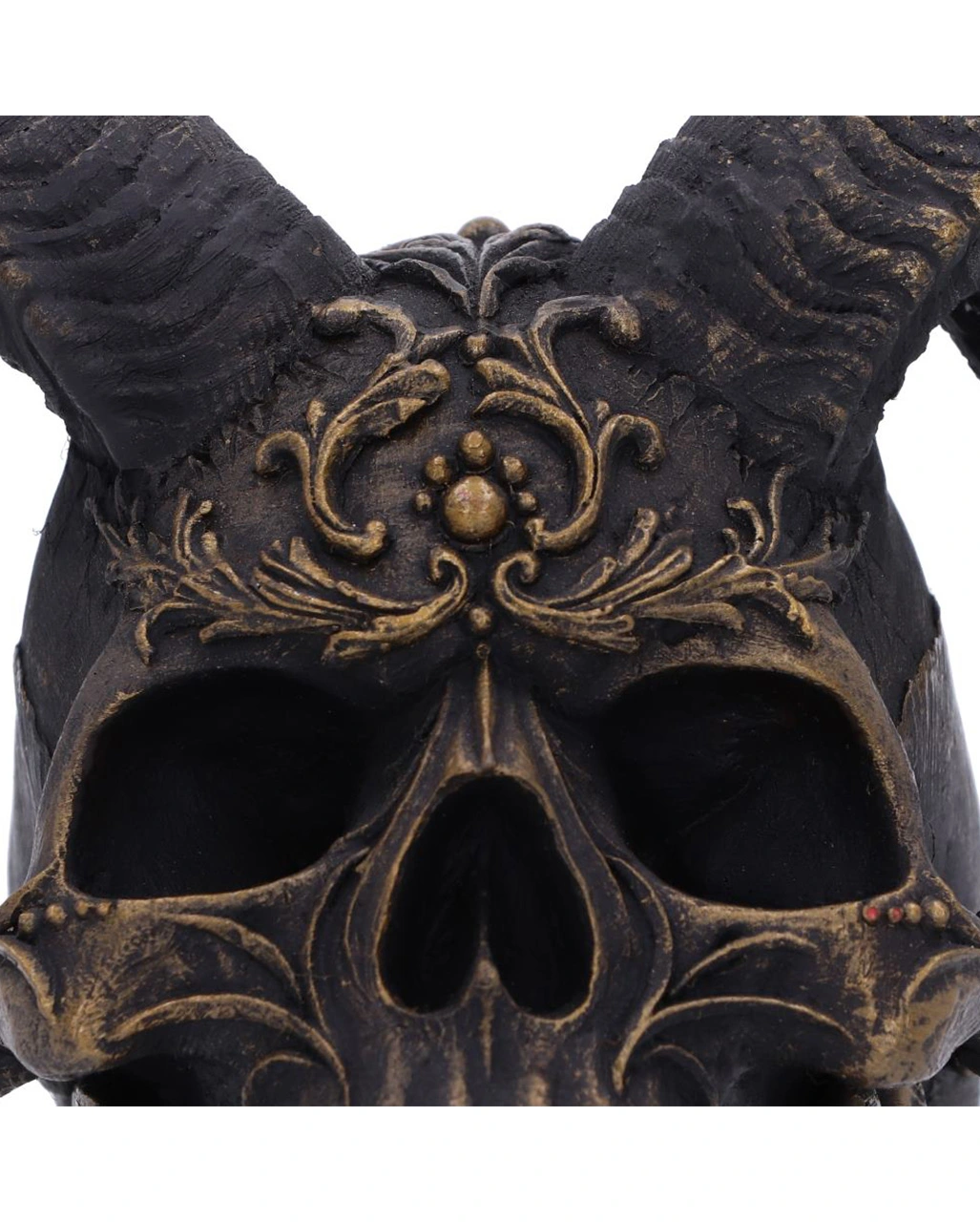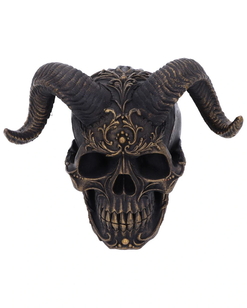 Diabolisch ist genau das richtige Wort, um diesen antiken Totenschädel mit Hörnern zu beschreiben. Der mystische Diabolus Totenkopf präsentiert sich mit mächtigen geschwungenen Hörnern sowie einem kunstvollen, floralen Muster. Der mit Widderhörnern verzierte Totenkopf ist eine fantastisch aussehendes Gothic Wohnaccessoire, das deine Vorliebe fürs okkulte widerspiegelt. Auch als Geschenkidee macht sich unser gehörnter Totenkopf ideal.