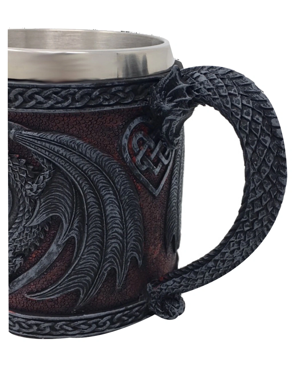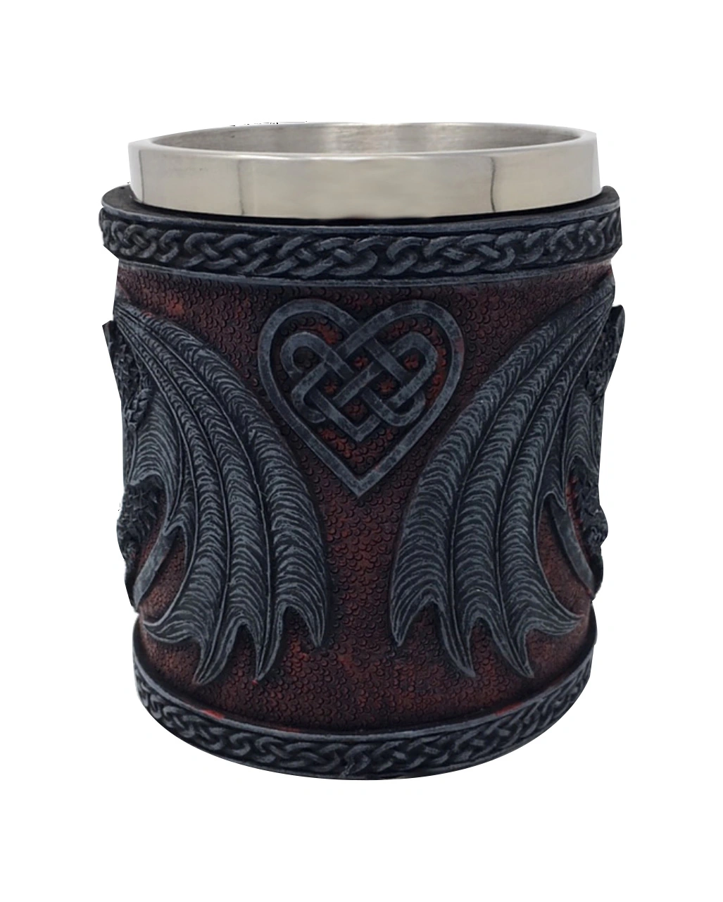 Der Drachenkrug mit Drachenherz ist etwa 11 cm hoch und kommt mit einem extra breiten Henkel. Dieser stellt einen verlängerten Drachenhals dar, der sich an die Tasse neigt. Der Körper des Kruges ist ebenfalls sehr detailliert ausgearbeitet und zeigt zwei sich anschauende Drachen, die ein Herz bilden. Dank des herausnehmbaren Edelstahleinsatzes lässt sich dein Drachenkrug mit Drachenherz schnell und einfach reinigen. Entdecke auch unseren atemberaubenden Drachen Altar Kerzenständer 3-armig, der für das richtige Flair an der Festtafel sorgt!