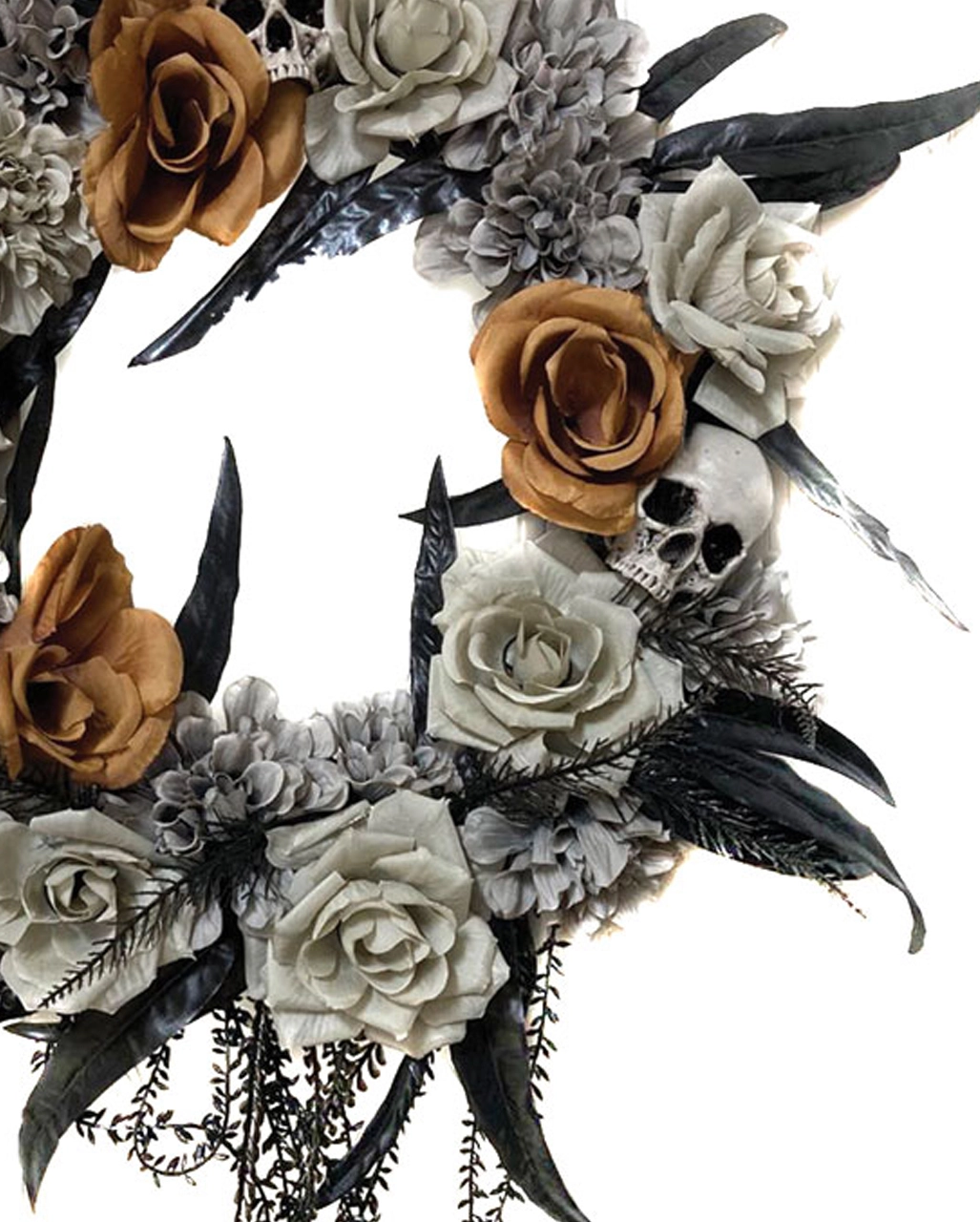 Morbider Blumenkranz mit Blumen, Federn & Totenschädel