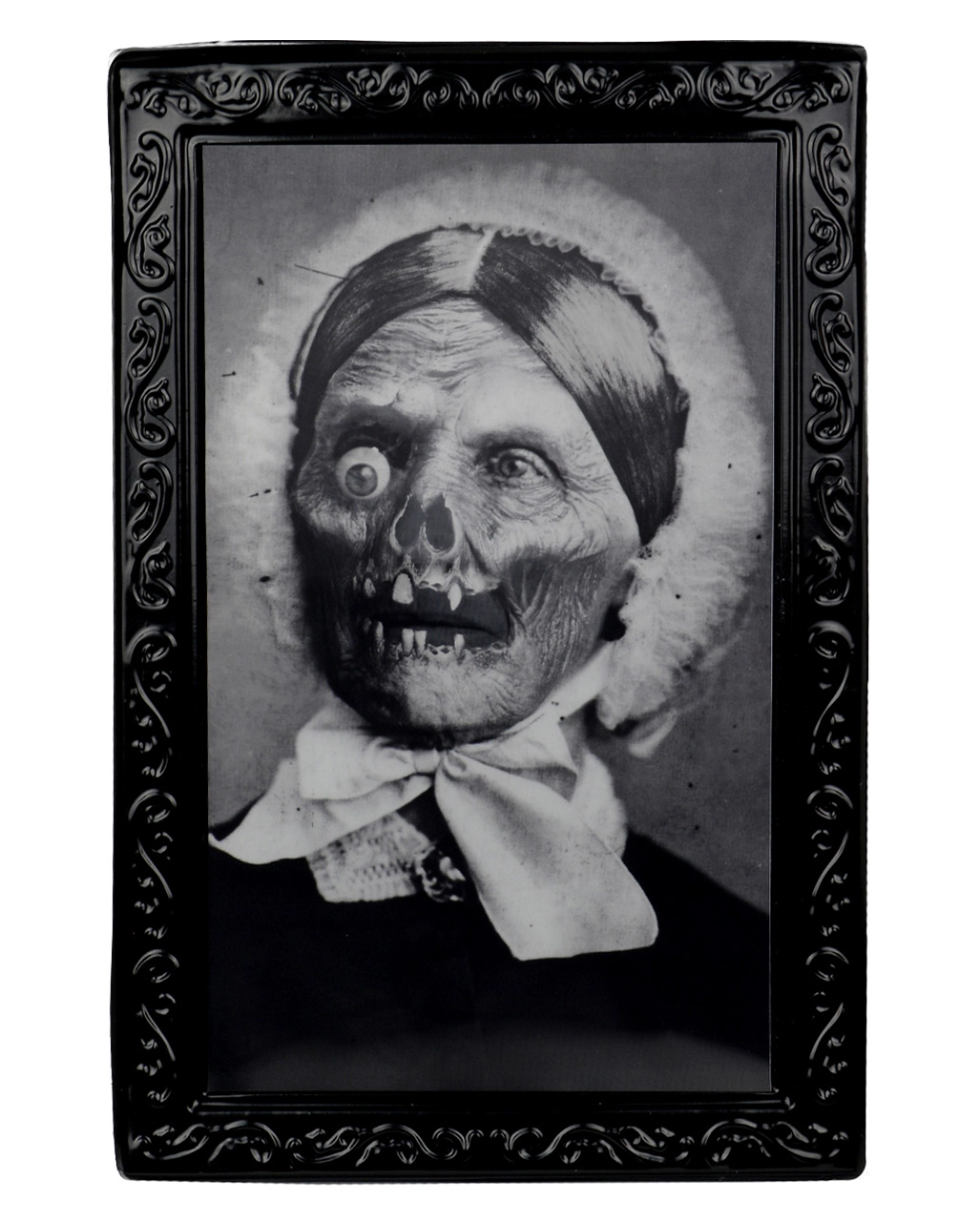 Das Hologramm Bild tote Schwester besticht durch seine geniale Optik. Im Stil einer alten, schwarz-weißen Fotografie gehalten, zeigt die Halloween-Deko eine verstorbene Frau; je nach Position des Betrachters wandelt sich das Bild jedoch und präsentiert eine fies grinsende Zombie-Fratze. Verschnörkelte Ornamente am Rahmen der Grusel-Dekoration lassen das Wackelbild zusätzlich besonders realistisch wirken. Weitere Halloween-Dekoartikel wie das Hologramm Portrait Zombie Großvater 38 x 51 cm und den R.I.P. Grabsteinkreuz Halloween Deko haben wir ebenfalls im Horror-Shop.com!