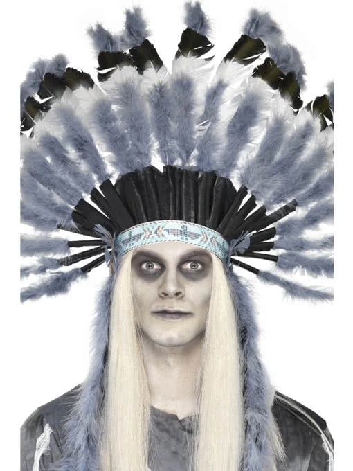Die Basis des Kopfschmucks bildet ein blaues Stirnband mit aufgedruckten altindianischen Zeichen. Der Federschmuck besteht aus kleinen grauen Marabufedern vorne und weißen Federn mit schwarzgefärbten Spitzen dahinter. Für den sicheren Halt auf dem Kopf sorgt ein Gummiband. Links und rechts an der Schläfe fällt ein Band aus Marabufedern über die Schultern. Passend dazu gibt es bei uns das Geister Indianer Kostüm oder das Haarspray Silbergrau.