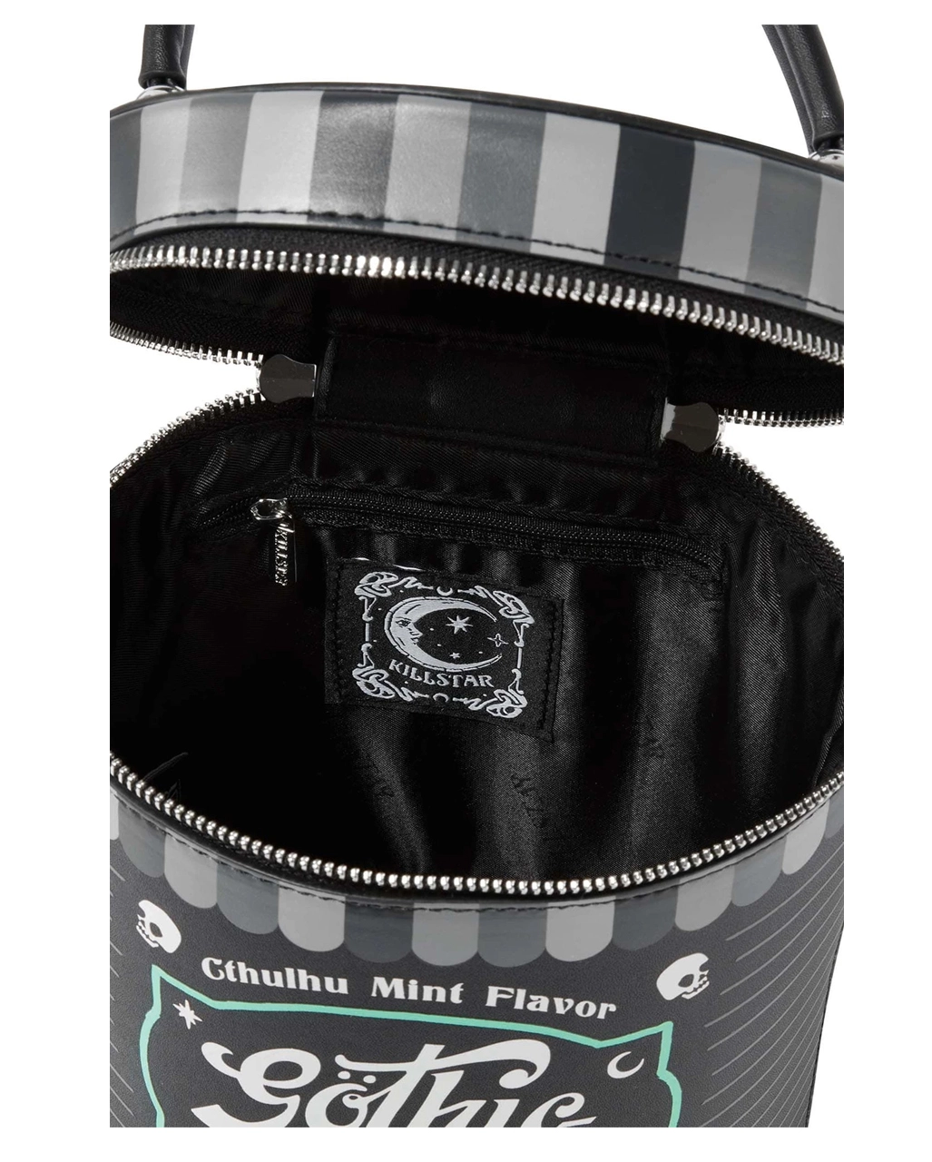 Neben deinen vielen anderen Gothic Mode Accessoire, die deinen alternativen Modestil definieren, hat die KILLSTAR Goth Dazs Handtasche einen ganz besonderen Stellenwert. Die niedliche und verspielte Gothic Handtasche besitzt die Form eines Eiscreme Behälters. Gothic Dazs‘ hat also eine runde Form und ein aufgedrucktes Cthulhu Motiv auf der Vorderseite. Die Tasche hat einen Reißverschluss und bietet genug Platz für alle wichtigen Utensilien – Damit ist sie perfekt zum Ausgehen, für Foto Shootings oder einfach nur zum Abhängen mit deinem Hexenzirkel!