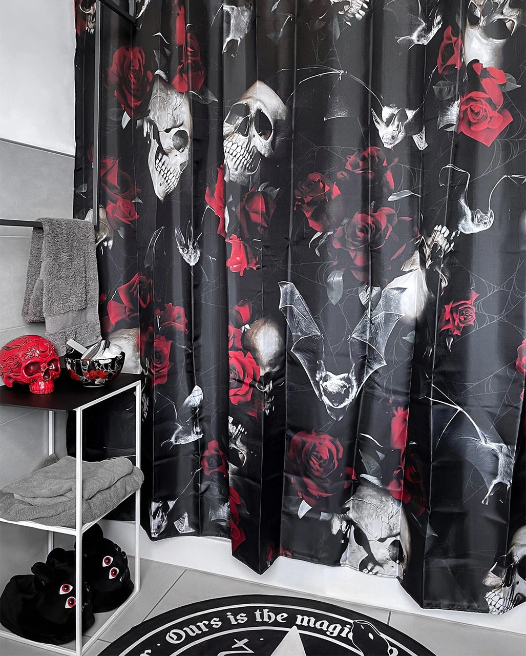 Unser KILLSTAR Haunted Garden Duschvorhang ist das perfekte Bad Accessoire für deine Gruft. Ein düster morbider Charme erfüllt deine Nasszelle. Totenköpfe und Fledermäuse schauen dir beim Duschen zu. Die Gänsehaut, die dir dabei über den Rücken läuft, ist ein Schauer des Wohlbefindens. Schließlich wird das Bad mit diesem stilvollen Gothic Wohnaccessoire zu einem neuen Lieblingsort. Düster, lustvoll und voller Motive, die von düsteren Legenden erzählen.