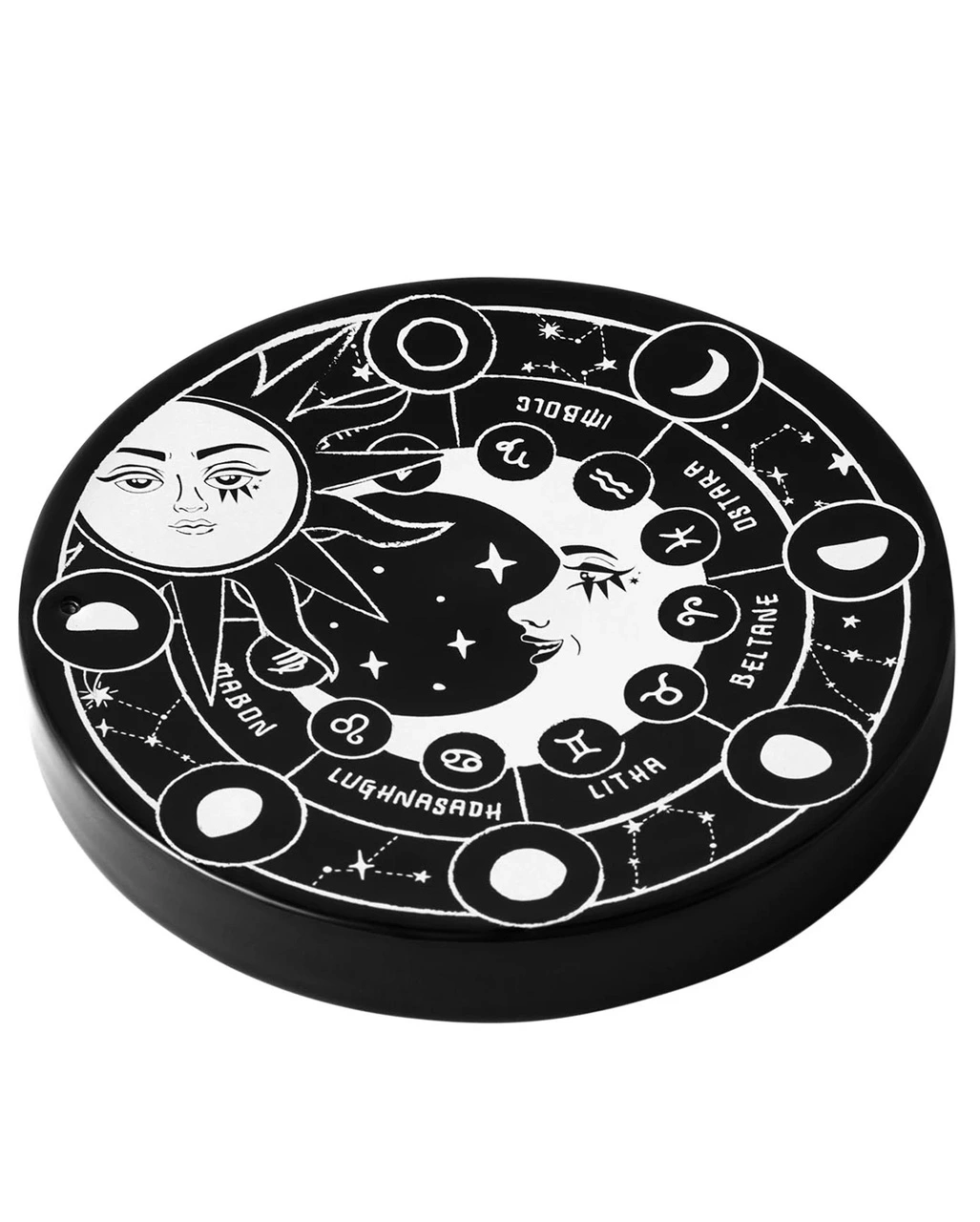 Dein okkulter Räucherstäbchenhalter von KILLSTAR ist hochwertige verarbeitet und eine mystische Gothic Homeware. Der Kosmos Räucherstäbchenhalter besteht aus Keramik und ist im Durchmesser ca. 15 cm breit. Das Motiv zeigt einen schwarz-weißen Aufdruck, in dessen Mitte sich ein Halbmond befindet. Dieser hat seinen Blick auf die neben ihm befindliche Sonne gerichtet. Um den Halbmond befinden sich einzelne Sektionen mit den Sternbildern und den verschiedenen Mondphasen. Entdecke noch mehr KILLSTAR Fanartikel wie die Ari Crescent Halbmond Metall Dose