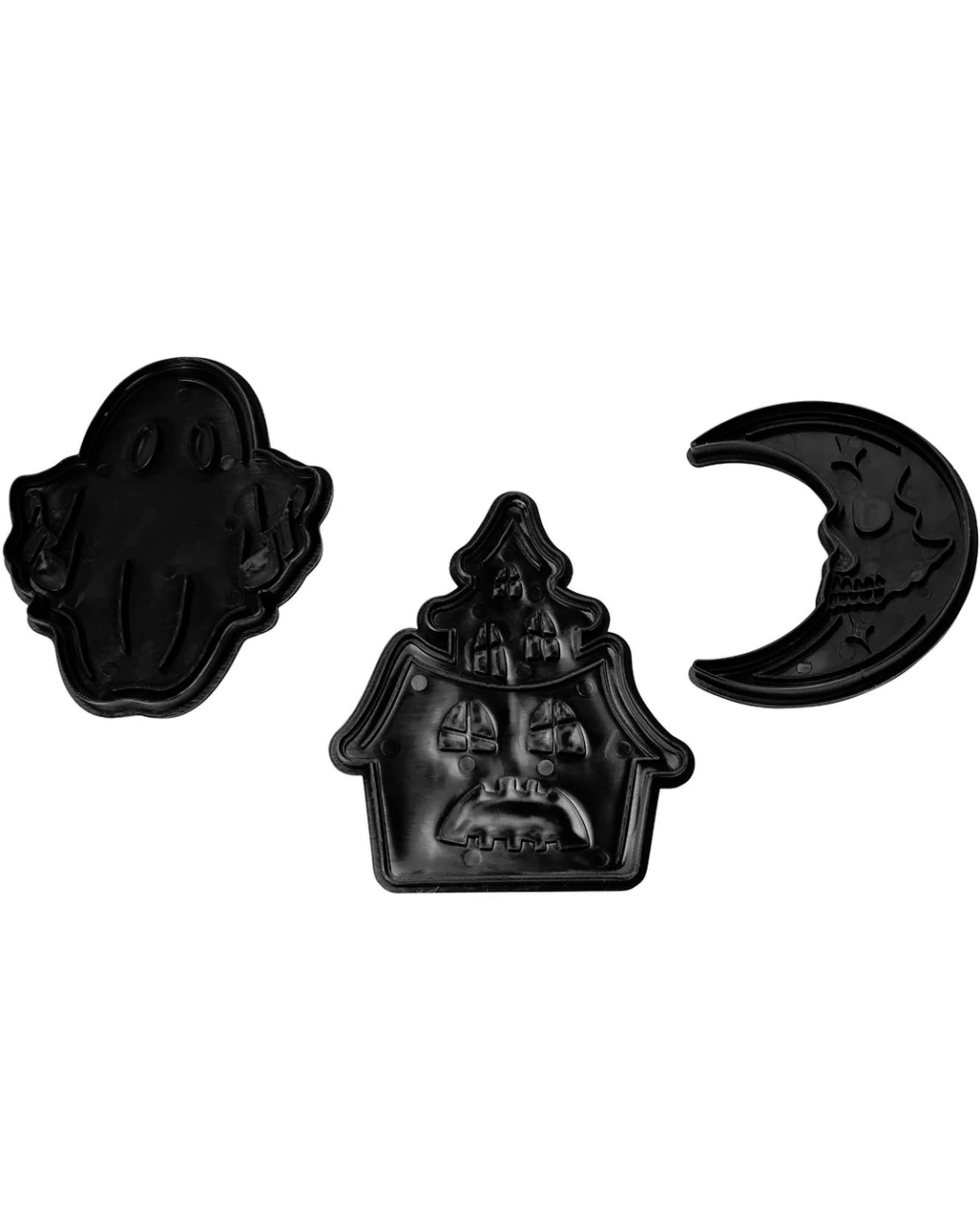 Verwende die KILLSTAR Spooktacular Keks Ausstecher an Halloween oder das ganze Jahr über. Das 3er-Pack wartet mit mit einem Mond mit Totenkopfgesicht, einem Spukhaus und einem freundlichen Geist aus schwarzem Kunststoff auf. Die Motive dieser Plätzchen Ausstecher machen jeder Gruselparty alle Ehre.