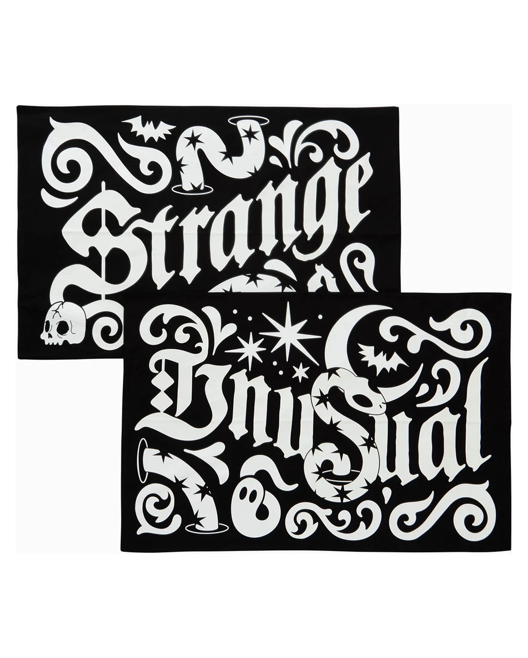 Du bekommst zwei KILLSTAR Strange Kissenbezüge als KILLSTAR Wohndeko. Die kontrastreiche Grafik zeigt die Schriftzüge „Strange“ und „Unusual“ – wenn das mal geheimnisvolle Kuschelmomente verspricht… Die schwarzweißen KILLSTAR Kissenbezüge sind je 74 x 49 cm groß und super weich. Der besondere Leuchteffekt macht dieses Gothic Wohnaccessoire noch eindrucksvoller. Wasche die Glow in The Dark Kissenbezüge bitte nur kalt und im Schonwaschgang. Entdecke auch den wunderschönen KILLSTAR Stellar Teppich und das Ouija Octagon Wahrsagebrett Glow in the Dark
