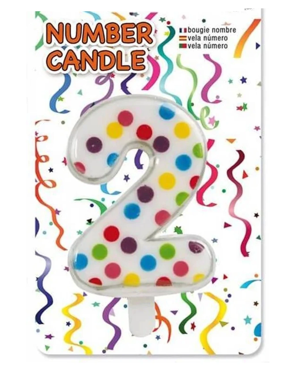 Bestelle jetzt die Konfetti Zahlenkerze Nr. 2 mit bunten Punkten und verwende diese für deine Geburtstagsüberraschung. Mit der 2 als Zahlenkerze lassen sich Torten für Geburtstage und Jubiläen besonders festlich dekorieren. In Kombination mit weiteren Ziffern kann jede beliebige Zahl kreiert werden.