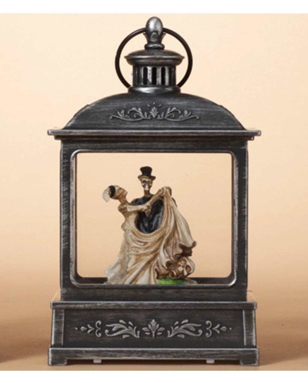Rauchige Laterne im antiken Stil mit tanzendem Skelett Paar als Halloween Deko