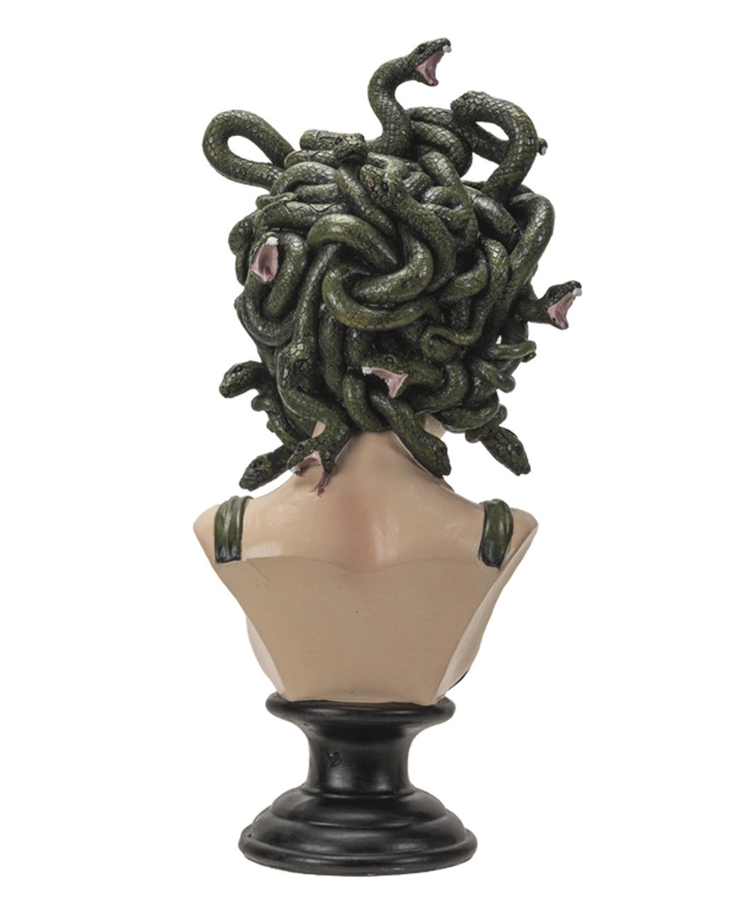 Bestell dir jetzt unsere Medusa Büste mit LED Augen und sorge damit für ein Highlight in deiner Kuriositäten Sammlung. Unzählige Schlangen mit aufgerissenem Maul schlängeln sich um das Haupt der morbiden Schönheit, die an eine Schaufensterpuppe aus den 20er Jahren erinnert.