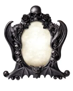 In Anlehnung an den ursprünglichen Gothic-Horror-Stil des 19. Jahrhunderts enthält dieser phantasmagorische Nosferatu Bilderrahmen alle Merkmale, die man von der nächtlichen Behausung eines Vampirs erwartet. Totenschädel, Drachen und Rosen zieren das Schlafgemach des legendären Blutsaugers. Natürlich darf die spitzzahnige Fledermaus nicht fehlen. Mit all diesen düsteren Elementen des Horror-Genres ist unser düsterer Vampir Bilderrahmen eine herrliche Gothic Deko, die deinen liebsten Fotos eine extravagante Umgebung bietet.