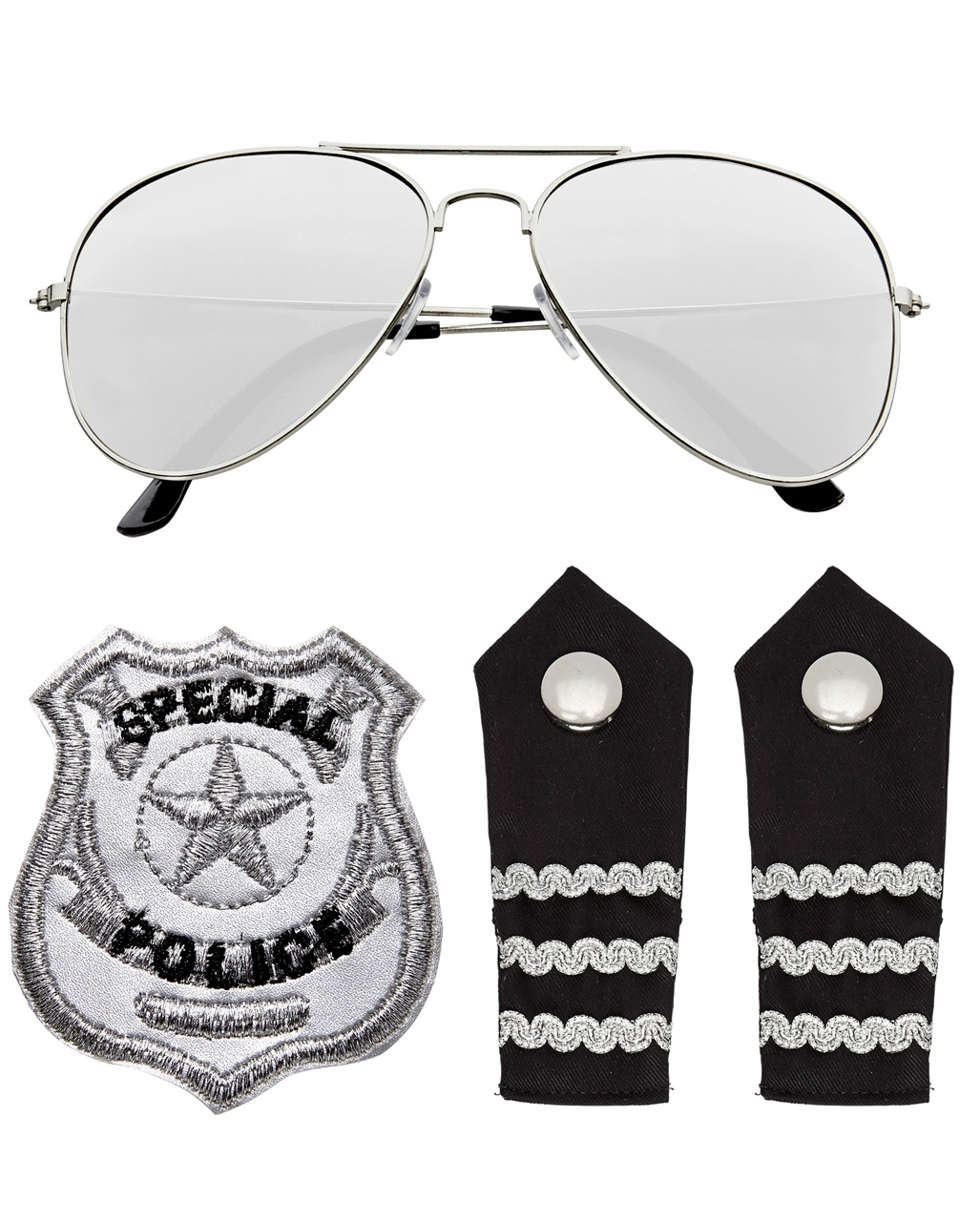 Das Polizisten Kostümzubehör Set besteht aus einer stylischen Sonnenbrille, zwei Schulterklappen mit Manchettenköpfen und Streifen sowie einem Abzeichen samt Stern und der Aufschrift „Special Police“. Komplettiere deinen Großstadt-Cop-Look mit unserer Police Officer Mütze und der Officer 8 8-Schuss Pistole.