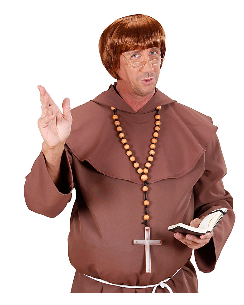 Der Rosenkranz mit Kreuz besteht aus einer schwarzen Kordel an die braune Holzkugeln aufgefädelt sind und in der Mitte ein braunes Kunststoffkreuz als Anhänger zeigt. Mit der realistsich aussehenden Ordenskette wirst du zum glaubhaften Klosterbruder.