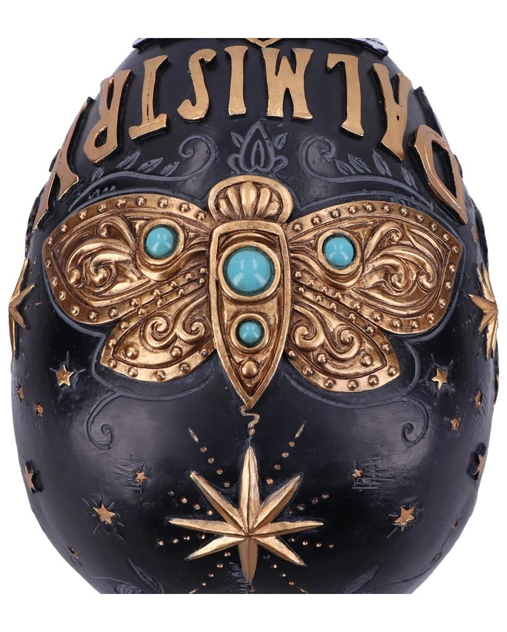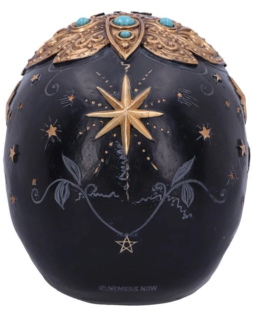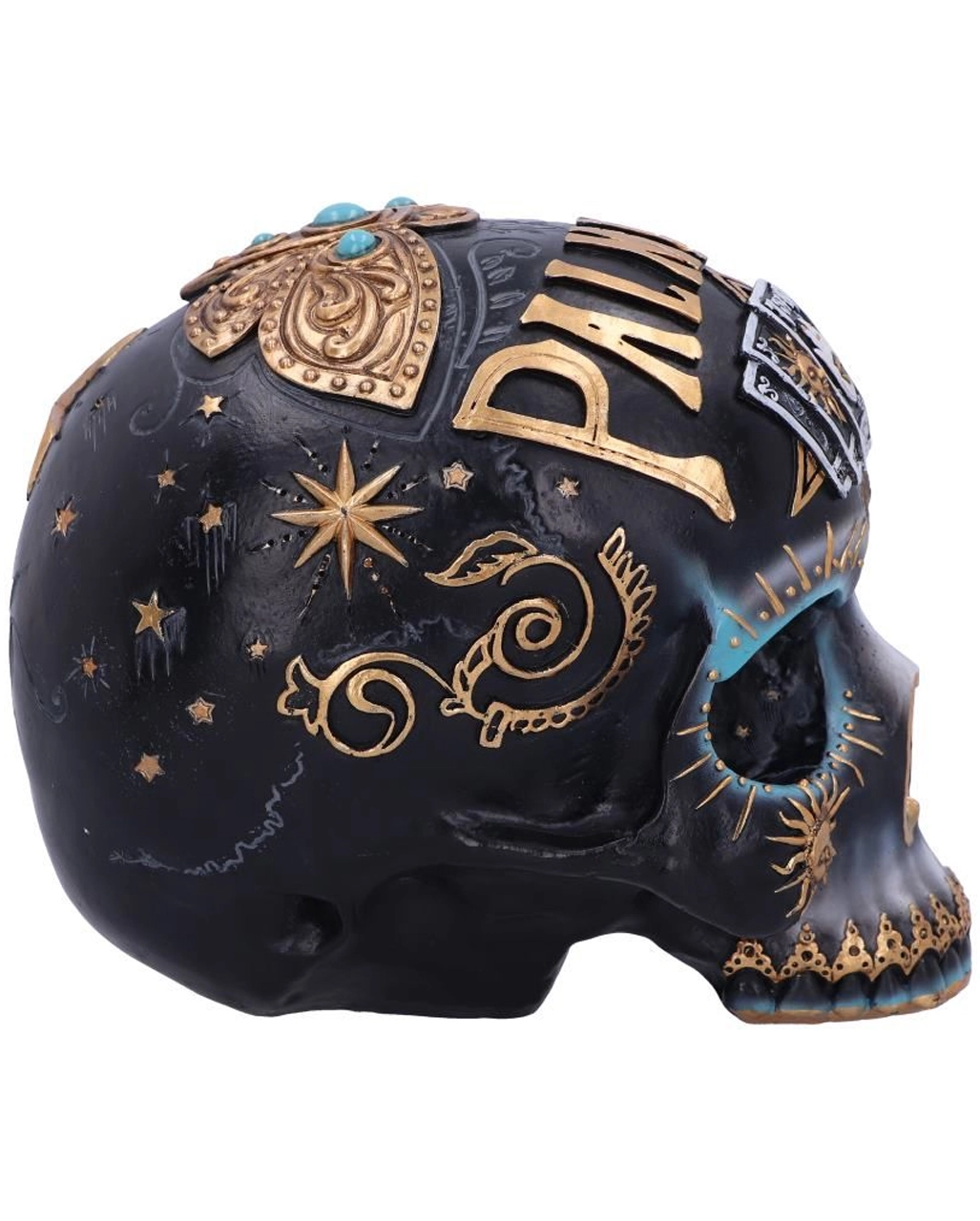 Die Handlesekunst ist ein besonderes Handwerk, das bis heute nichts an Faszination verloren hat. Hierbei sollen die Form und Linien auf den Händen Rückschlüsse auf das Wesen eines Menschen zulassen. Wenn auch du daran glaubst, dann ist unsere Palmistry Deko genau das Richtige für dich. Der Schicksal der Handlesekunst Gothic Schädel ist mit schwarzer Farbe bemalt und mit mehreren Tarot-Karten auf dem oberen Schädel verziert. Das Wort „Palmistry“ ziert die Oberseite des Schädels. Diese schöne Gothic Wohndeko weist auch verschiedene Symbole und astrologische Zeichen auf, die die Seiten des Schädels mit goldenen Details schmücken.