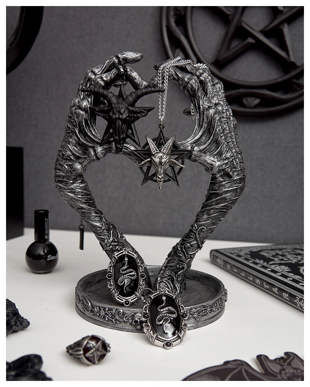 Diese formschöne, schwarze Gothic Baphomet Halskette ist ein eindrucksvoller Blickfang. Nicht nur als Halloween Kostümzubehör, sondern auch als Alltagsschmuck macht sich die Kette super, denn sie überzeugt mit einer detailverliebten Ausarbeitung. Der Baphomet-Halsschmuck lässt sich in seiner Länge verstellen und kommt mit einem großen, dreidimensionalen Ziegenkopf & Pentagramm als Anhänger.