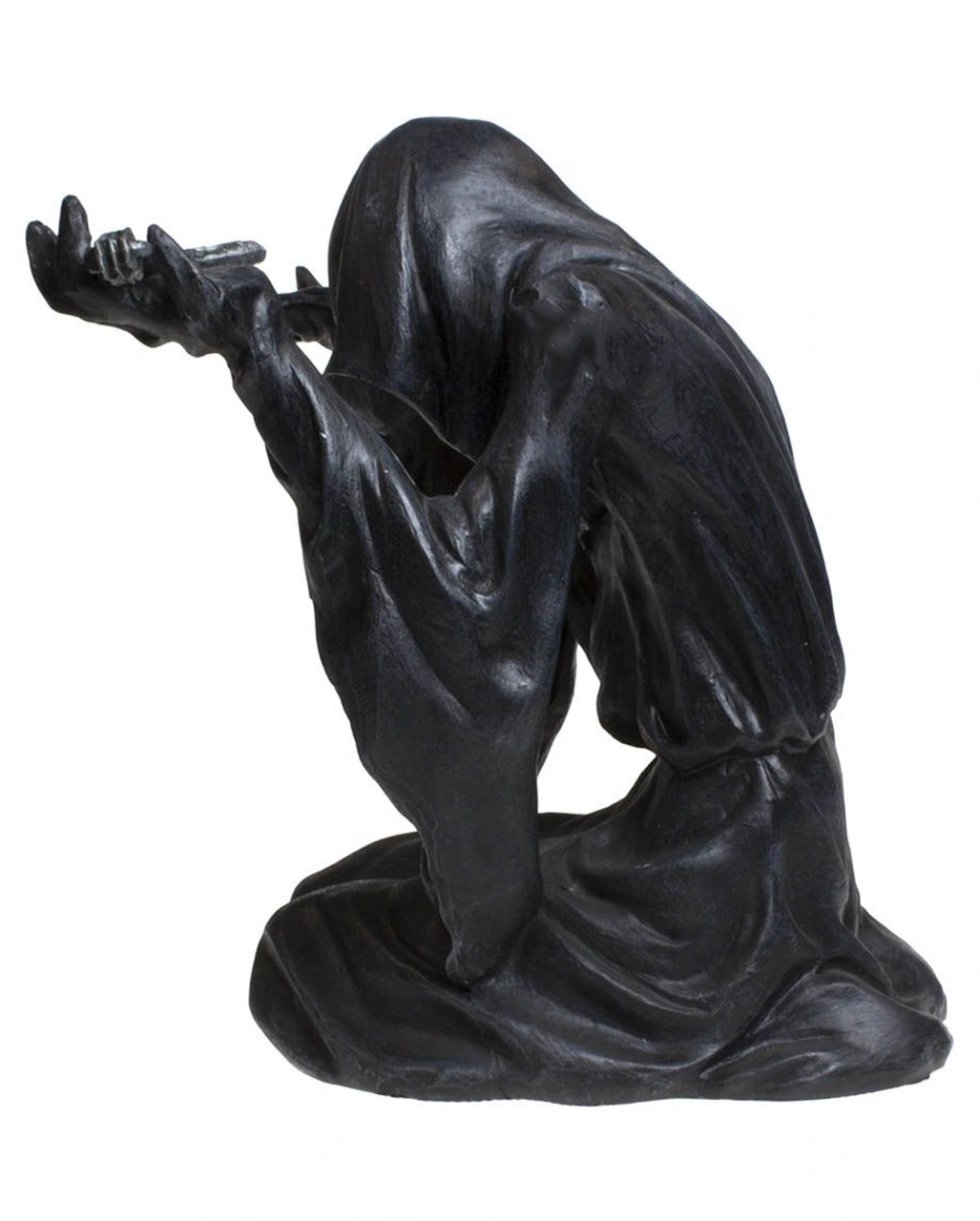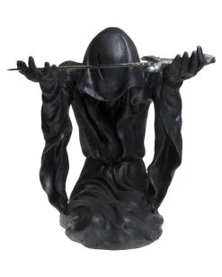Der dunkle Sensenmann ruht kniend und mit gesenktem Haupt, während er die Arme in Unterwerfung nach oben hebt. Sein schwarzer Mantel hängt herab und verdeckt sein skelettartiges Gesicht, das dieser Figur eine unheimliche Aura verleiht. In seinem zaghaften Griff befindet sich eine kleine Klinge, mit der er dich deine wertvollste Post öffnen lässt. Der Grim Reaper Brieföffner ist nicht nur ein einzigartiges Gothic-Geschenk, sondern auch ein dekoratives Wohnaccessoire im Sensenmann-Look!