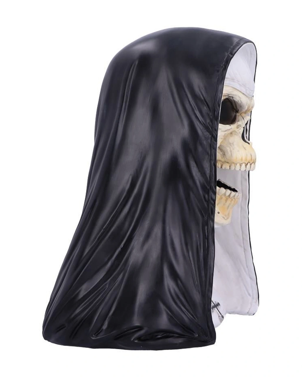 Die skelettierte Nonne im klassischen Habit ist der Stoff, aus dem Albträume sind! Die tiefschwarze Nasenhöhle und die düstern Augenhöhlen weisen den ikonischen, kantigen Stil von Sister Mortis Artwork auf. Ihr Mund ist weit geöffnet, so als würde sie den Betrachter anschreien. Um den Hals der unheimlichen Kunststein Nonne liegt eine Perlenkette, die ein umgedrehtes Kreuz als verfluchtes Schmuckstück hält… Diese religiöse Figur ist nicht so, wie sie scheint.