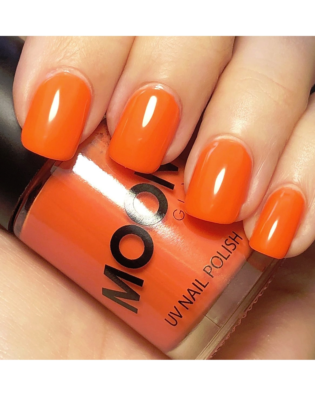 Professioneller, intensiver UV Nagellack Neon Orange als knallige Fingernagel Farbe, die im UV-Licht & Schwarzlicht leuchtet. Der UV Nagellack in Neon Orange ist ein absoluter Hingucker für alle 80er Jahre, Bad Taste & Schwarzlicht Mottoparty Kostüme.